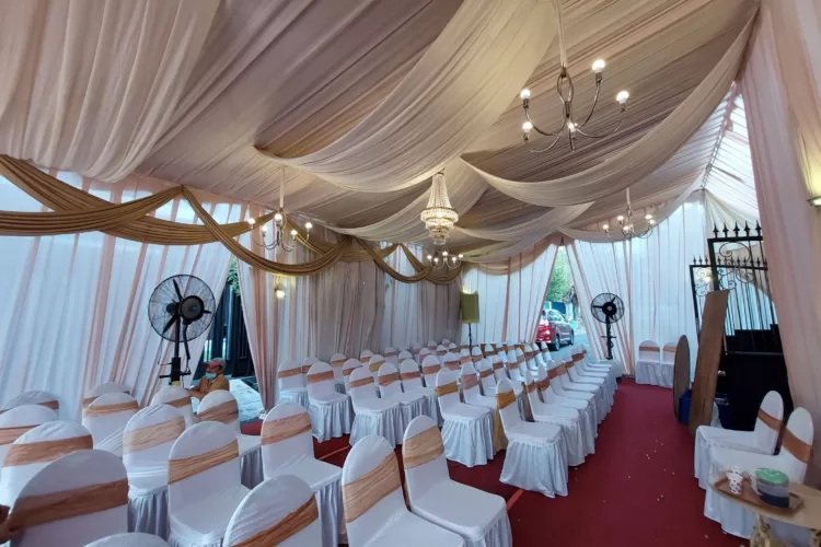 Tenda Drafery & Kursi Cover acara Wedding Party SPES Rental Equipment Service Layanan Rental Alat Pesta di Surabaya – Sewa Tenda Drafery, Tenda Slayer, Meja, Kursi, Panggung dan Alat-alat Pesta lainnya.